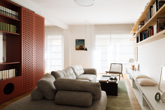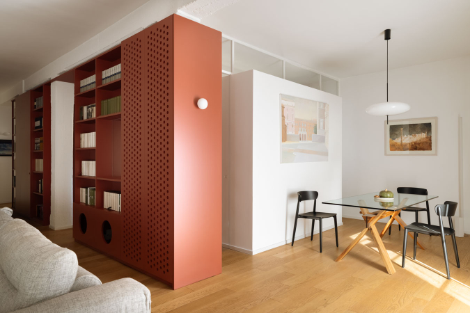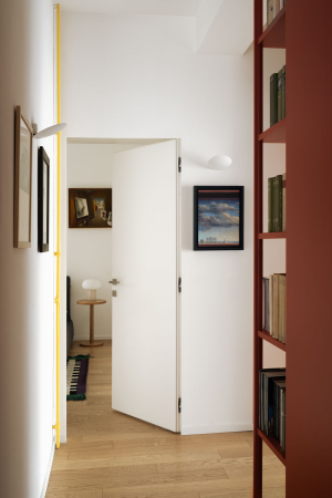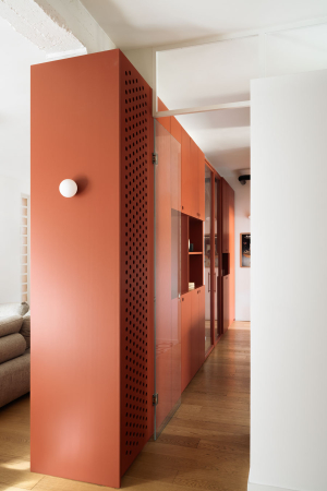 Rosso Falun è un intervento di ristrutturazione chiavi in mano che ha completamente rivoluzionato la distribuzione e la spazialità interna di un appartamento nel cuore di Roma, nel quartiere Trieste. L’obiettivo di tale intervento è stato quello di portare la corretta luce naturale in tutti gli ambienti e di renderli più vivibili. La nuova configurazione degli ambienti è stata concepita esclusivamente con mobili attrezzati che non raggiungessero mai l’altezza massima del soffitto, affinché il rimbalzo della luce su di esso potesse penetrare maggiormente negli ambienti. In particolar modo quelli della zona giorno accolgono anche un divertente rifugio per gatti che si articola lungo tutto il perimetro. Il colore predominante della casa è il rosso falun, un pigmento usato frequentemente in Svezia per verniciare le case di legno, la cui colorazione prende il nome dalle miniere di Falun nella Svezia Centrale. La casa, pur con le linee asciutte degli arredi artigianali, mantiene quel calore e accoglienza tipici dello spazio domestico che accoglie l’ospite svelando ad esso la sua anima privata.